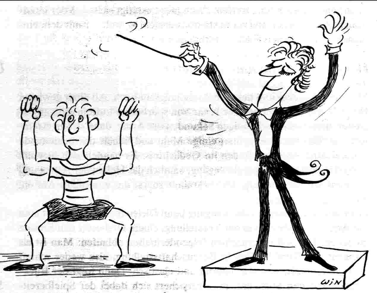 Das ist beim Dirigieren (vgl. auch Coblenzer/Muhar 1976, 57ff) anders. Der ganze Körper ist in Bereitschaftsstellung: Man kann aus den Knien heraus leicht federn, und beim Blickkontakt mit den Musikern sammelt man ihre und die eigene Konzentration auf das Stück. Diese Aufmerksamkeit erreicht ihren Höhepunkt im Hochheben der Arme. Die Atmung geht dabei dem Heben der Arme zeitlich etwas voraus, die Bewegung wird vom Atem getragen. Das kann man selbst ausprobieren: mit den Knien leicht federn, sich die Musiker vorstellen, Blickkontakt zu ihnen herstellen und: dann geht's los. Wenn man das mehrmals wiederholt, merkt man, dass man aus der Einstellung und Zuwendung heraus stets annähernd die gleiche Bewegung hervorbringt: die Arme sind leicht angewinkelt auf einer mittleren Höhe, alle Muskeln sind etwa gleich gespannt, das Gewicht der Arme wird als leicht empfunden. Auf der Höhe der Einatmung bleibt die Bewegung in der Schwebe. Das Dirigieren wird von der Atmung getragen. Der Körper befindet sich in einer mittleren Anspannung, einer Wohlspannung oder Eutonie. Diese Einstellung und Zuwendung, wie sie die Dirigier-Übung vermittelt, braucht man auch bei jedem Vortrag oder Gespräch. (c) Pabst-Weinschenk 2001/2004 |