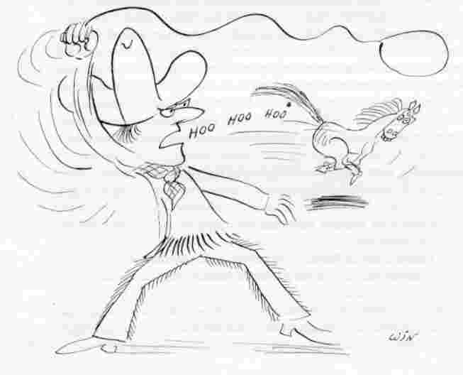 Auch Tauziehen und Lassoschwingen sind rhythmische Bewegungen, die oft von „Hau ruck“- oder „Ho-ho“-Rufen begleitet werden. Auch dabei stellt sich automatisch eine zweckmäßige Atmung ein, die gut fürs Sprechen ist (vgl. Coblenzer/Muhar 1976, 30f). Mit rhythmischen Schwingbewegungen - man kann auch eine liegende Acht in die Luft malen - kann man gut zweisilbige Aussprüche laut rufen, ohne die Stimme zu überschreien, z. B.: „Hier her!“ - „Wer denn?“ - „Hilf mir!“ - „Was denn?“ - „Halt fest!“ - „Hab ich!“ - „Ganz nah!“ - „Geh fort!“ Usw. (c) Pabst-Weinschenk 2001/2004 |